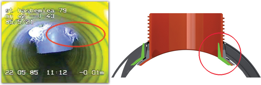 C) R-shaped design of the sealed rubber edges inside the pipe to prevent the sludge from falling behind the rubber seal and prevent the sewage network from blocking